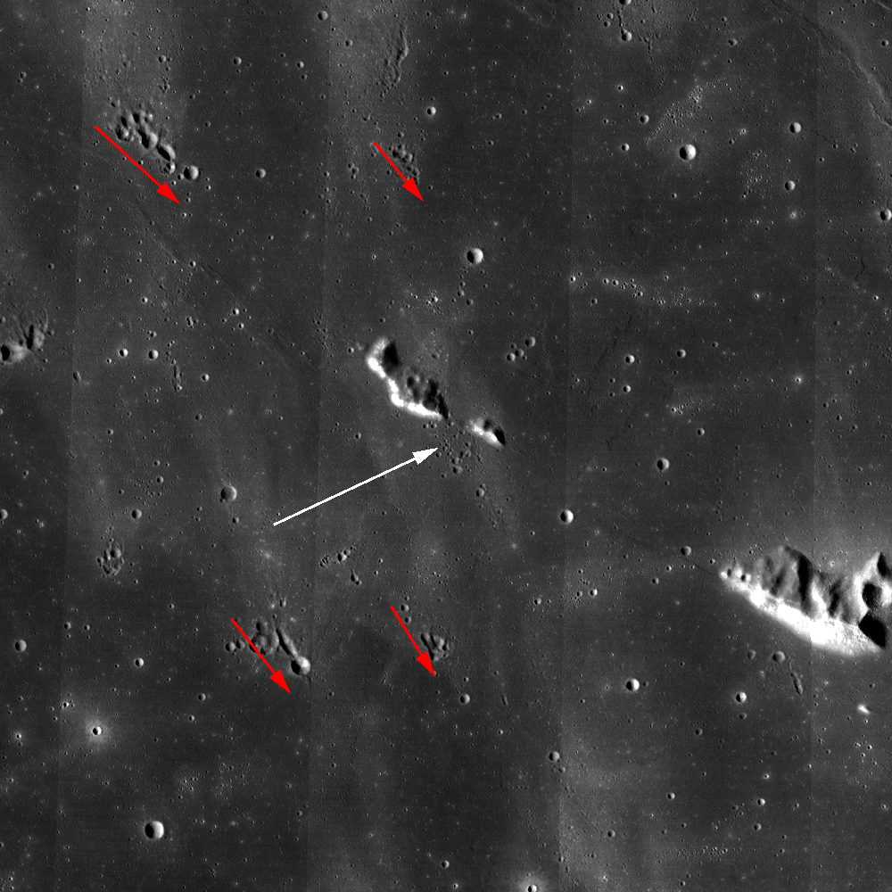 Several large depressions dot the surface of Mare Imbrium, giving the impression of a four leaf clover. LROC NAC M190780929RE, image width is 1500 m [NASA/GSFC/Arizona State University].