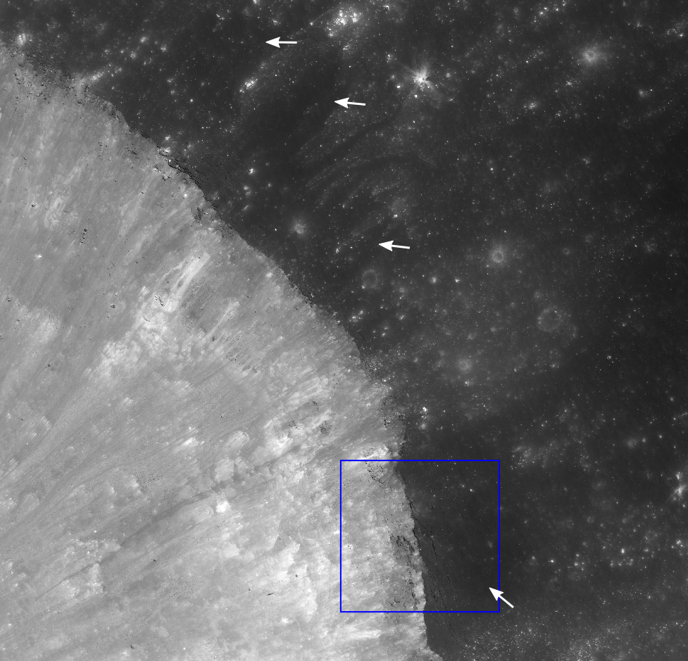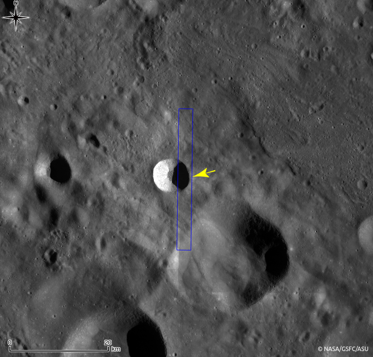 Today's Featured Image highlights the eastern rim of an unnamed young crater (about 6.8 km in diameter), observed in the farside highlands, 218 km southwest from the center of Hertzsprung crater (587 km in diameter). The higher reflectance area (left side of image) is the crater wall inside the crater cavity, and the low reflectance area (right side of image) is the outer surface of the crater, covered by a layer of dark impact melt deposits (see next NAC context view). The low incidence angle (Sun overhead, 7.2° from vertical) enhances the strong reflectance contrast between the fresh anorthosite-rich outcrops on the crater wall and fresh impact melt rocks on the crater exterior. During the cratering process, impact melt was ejected from the crater and placed on the crater exterior, forming a thin layer, or veneer, which solidified into solid rock as it cooled.