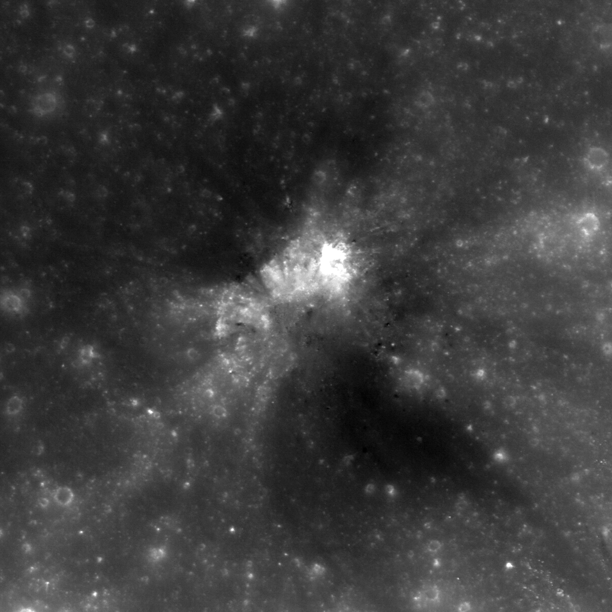 Another crater in the image above (located at 7.608°N, 6.221°E) found on the southern rim of Hyginus is a perfect contrast to the crater in the Featured Image. The rim of the crater is hard to see in this image, but the diameter is ~20 m. This crater is smaller, so it excavated material from a shallower depth compared to the Featured Image crater, and therefore did not sample the buried pyroclastic deposit. The rays from the crater on the southern rim are high reflectance, which is typical of immaturity rays made of fresh material, in comparison to rays made from material compositionally different from the surrounding area.