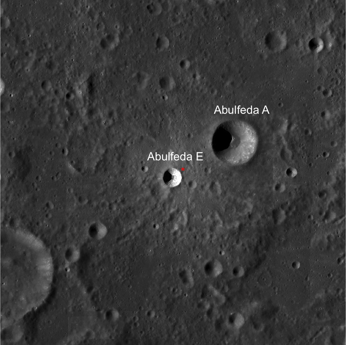 WAC context image showing Abulfeda E and its larger neighbor Abulfeda A. The red asterisk marks the location of the Featured Image [NASA/GSFC/Arizona State University].