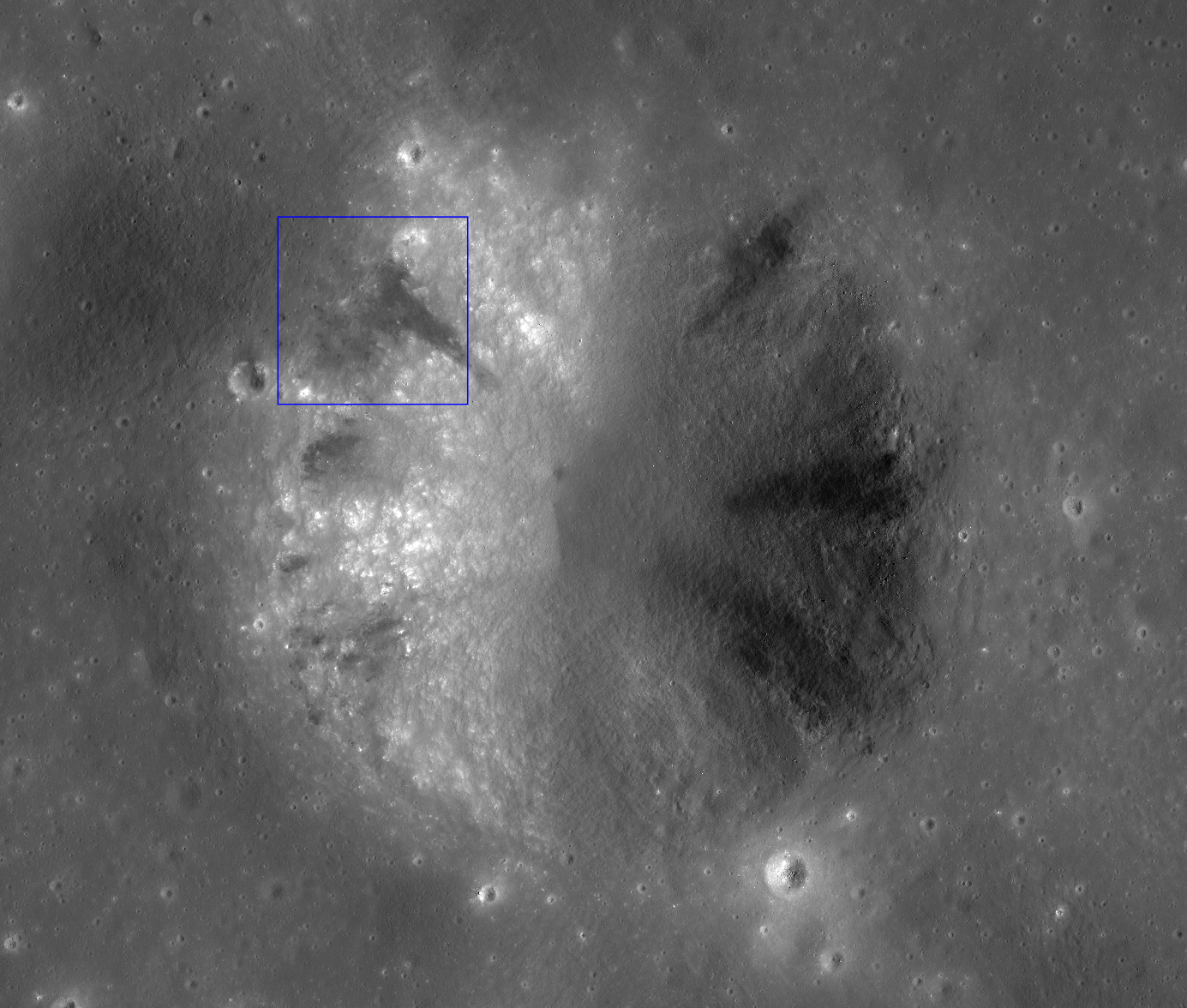 Southern Sinus Aestuum (latitude 5.42°N, longitude 351.36°E) is famous for its extensive dark mantle deposits (DMD), materials which have the lowest albedo (reflectivity) on the Moon. The DMD were likely formed as explosive eruptions threw out a blanket of small particles (pyroclasts). Today's Featured Image is a portion of unnamed crater rim located inside this DMD unit. This crater is about 2.4 km in diameter and has 4 or 5 dark streaks on its slope (see NAC zoom out mosaic below).