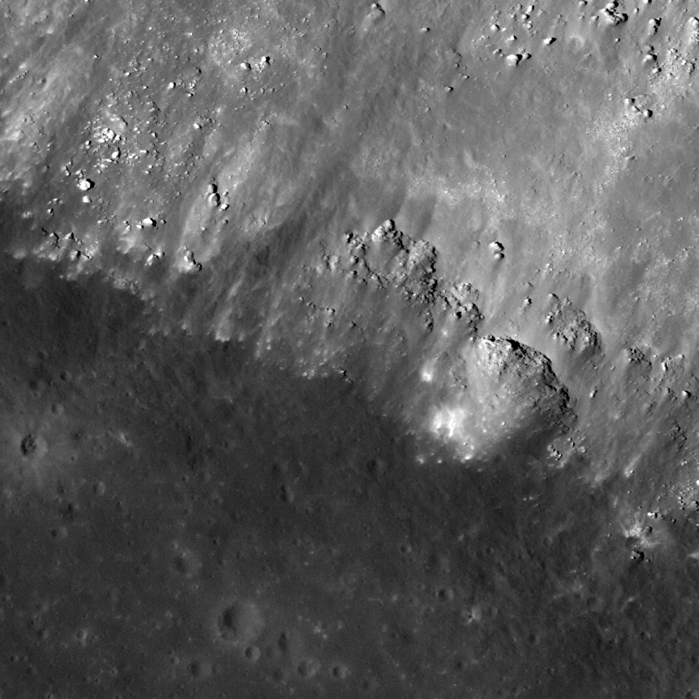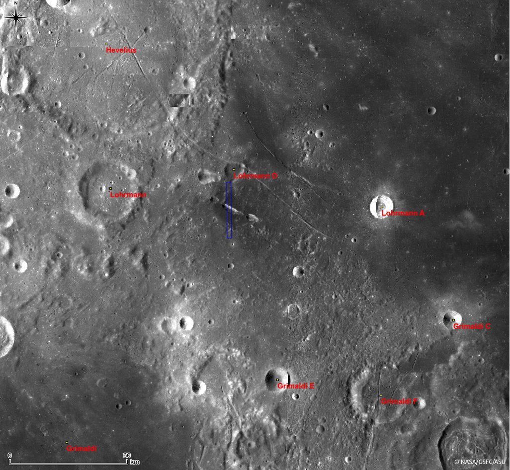 Today's Featured Image highlights a portion of an unnamed vent (latitude 0.80°S, longitude 294.69°E) located about 20 km south of Lohrmann D crater that extends northwest to southeast and parallel to Rimae Hevelius. The size of this vent is about 12.5 by 3 km. Due to the surrounding relatively smooth and low albedo materials in this area (see WAC context image below), a volcanic eruption associated with pyroclastic deposits is suspected here.