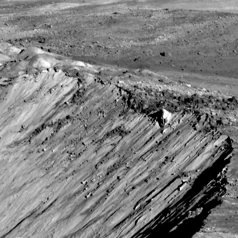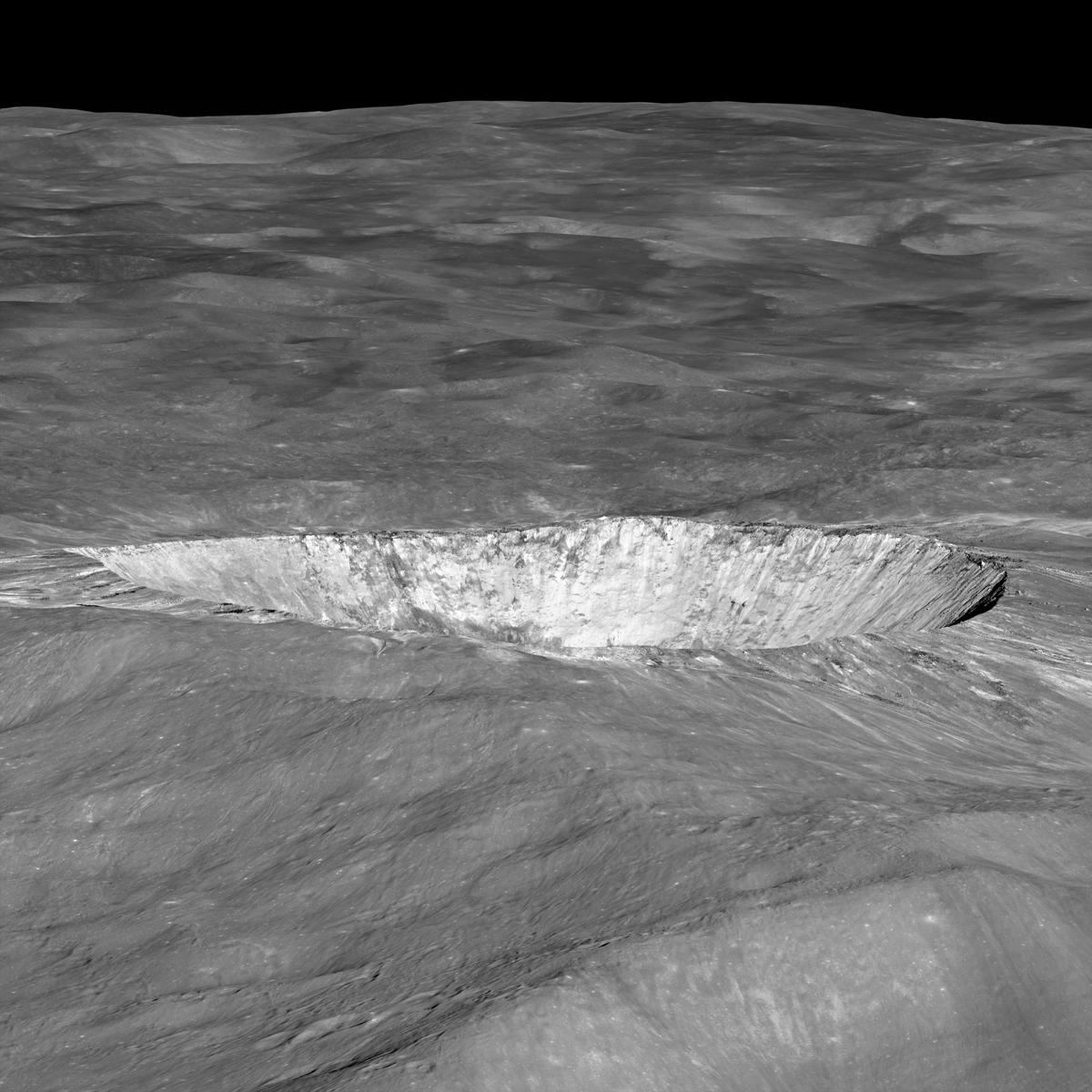 LROC has captured many sensational views of the crater Giordano Bruno (35.9°N, 102.8°E). We return again and again to this rayed beauty because it is a nearly pristine example of the effects of impacts on the lunar surface. It displays an immense ejecta blanket with beautiful secondary craters and is an excellent illustration of how rocks melted by impacts flow and pond. The crater also exposes fresh highland material, with minimal effects from space weathering. Today's Featured Image, captured by slewing the spacecraft 79° to the east, provides another sensational view that helps us understand the impact process, and until astronauts visit Giordano Bruno, gives a view about as close as you can get to standing on the surface to the west of the crater.
