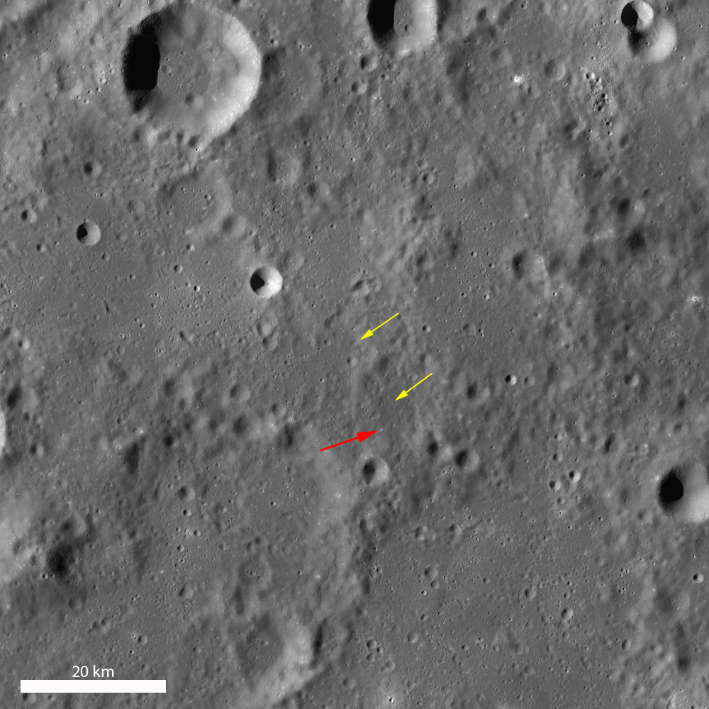 Today's image is of a 100 meter diameter crater (29.814°S, 11.465°E) located in highland terrane between Tycho crater and Nectaris basin. However, it doesn't look like a normal bowl-shaped crater by any stretch of the imagination! The top half looks like it has been shifted to the right relative to the bottom half, which is consistent with motion along a right-lateral strike-slip fault. Likely this odd crater was cut by a fault associated with the nearby Poisson lobate scarp. The faulting helps us determine the relative age of local features. The crater on the right does not appear offset, so that tells us that the fault was active after the crater on the left formed (thus offsetting it) but was not active since the formation of the crater on the right! This relationship also indicates that the crater on the left is older than the crater on the right. Observations like these allow scientists to assign relative ages to features on the surface; the only way to accurately determine absolute ages for features this small is to bring back samples for radiometric age dating. If you were to look at this crater using WAC data (see below), you couldn't tell that it was offset by a fault but you could spot it due to its high reflectivity. High resolution NAC images like these have shown that there is relatively recent, small-scale tectonic activity and that the Moon is far from being geologically dead!