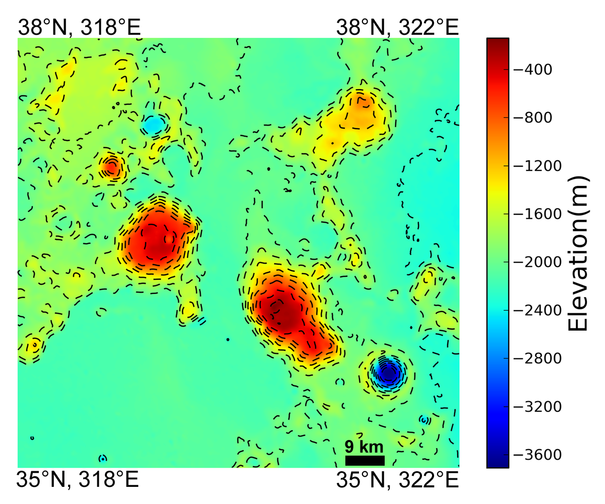 Colorized topography of the Gruithuisen Domes region derived from the 100 m/pixel LROC WAC DTM. Contour line interval is 220 meters [NASA/GSFC/Arizona State University].
