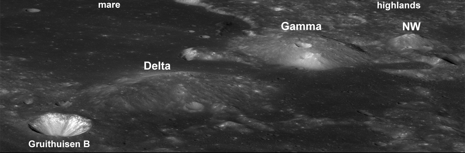 The last LROC Featured Image post on the Gruithuisen Domes featured some of the earliest NAC coverage of this amazing region. Now LROC brings you even more dramatic views of these volcanic domes from an oblique angle (viewing from East to West) at an altitude of 154 km (~96 miles) above the lunar surface. Located along the mare/highlands boundary on the northeast border of Oceanus Procellarum (36.6°N, 319.9°E), the three Gruithuisen domes Gamma, Delta, and Northwest (NW) are primary examples of lunar silicic volcanism.