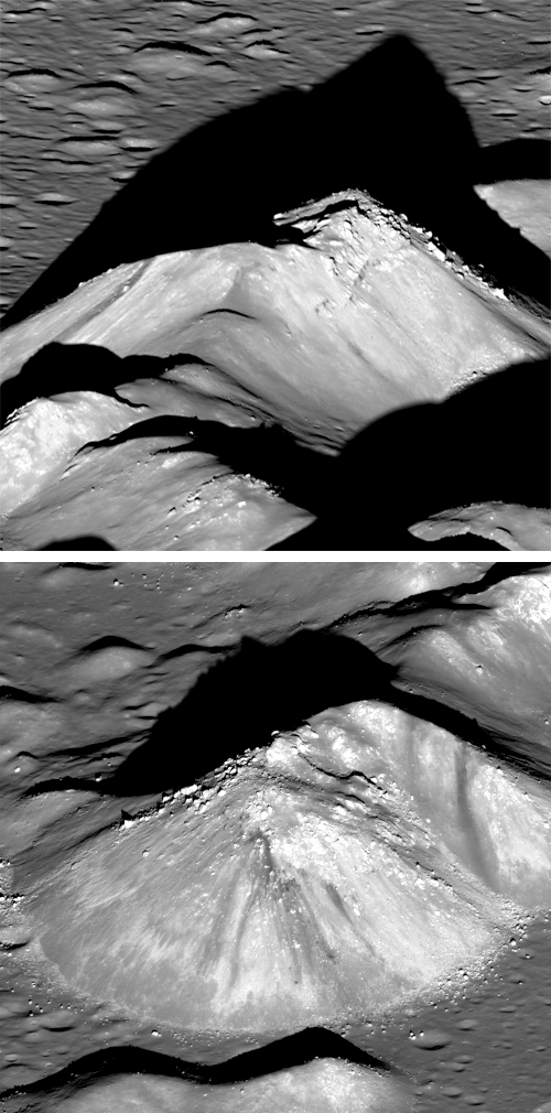Back to Copernicus, what are those dark streaks we see on the peak? In the comparison image above, and if you skip back to the earlier post that shows the other side, that dark streak is seen on both sides of the central peak, showing that it is three dimensional within the peak. Might it be a dark rock intruded as a dike into the light colored crystalline bedrock that was brought up from beneath the deepest part of the transient cavity in the Copernicus target? Or is it simply a dark rock that is eroding and slumping down the sides of the peak?