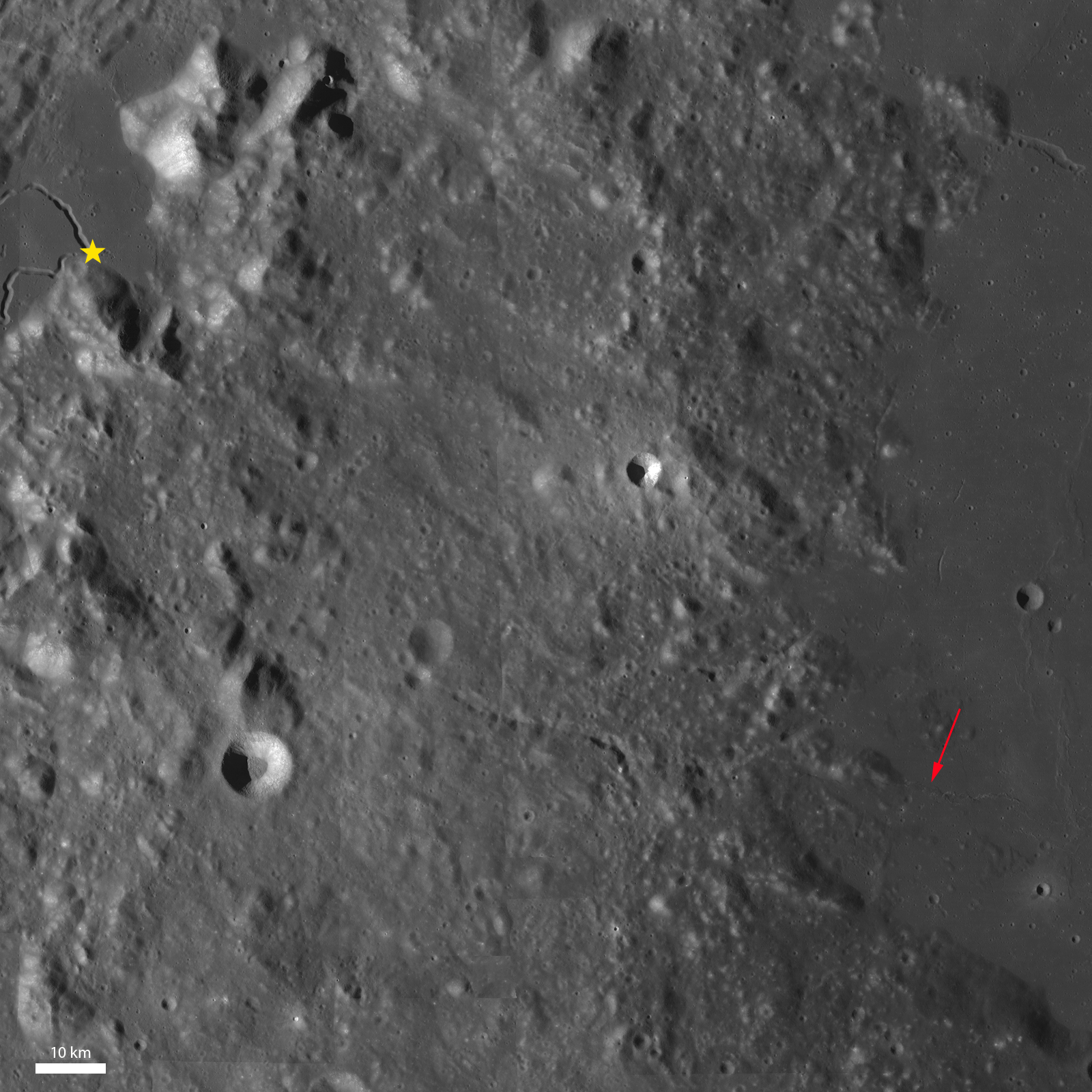 A wrinkle ridge in western Mare Serenitatis (23.448°N, 8.058°E) is one of many in the region that exhibits a high boulder density and high albedo (bright) summit areas. But it isn't the only place this relationship is seen! These bouldered ridges are also observed in Oceanus Procellarum, Mare Humorum, Mare Cognitum, and Mare Nubium, to name a few. Scientists are still uncertain as to why some ridges have these features and others don't, and why this isn't observed along the entire ridge. This ridge seems to be eroding along its slope, rather than the crest, suggesting that the material is coming from the ridge itself. In addition, a small impact crater (red arrow in below image) has excavated boulders and high albedo material, making it more likely that the source is from the ridge and not a product of distant cratering events.