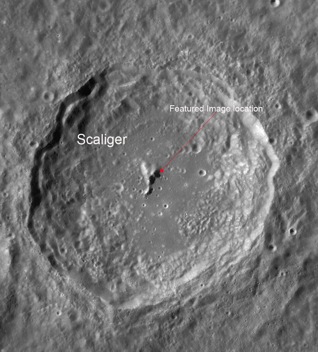 The WAC mosaic context image shows the full size of Scaliger crater; image is ~110 km wide [NASA/GSFC/Arizona State University].