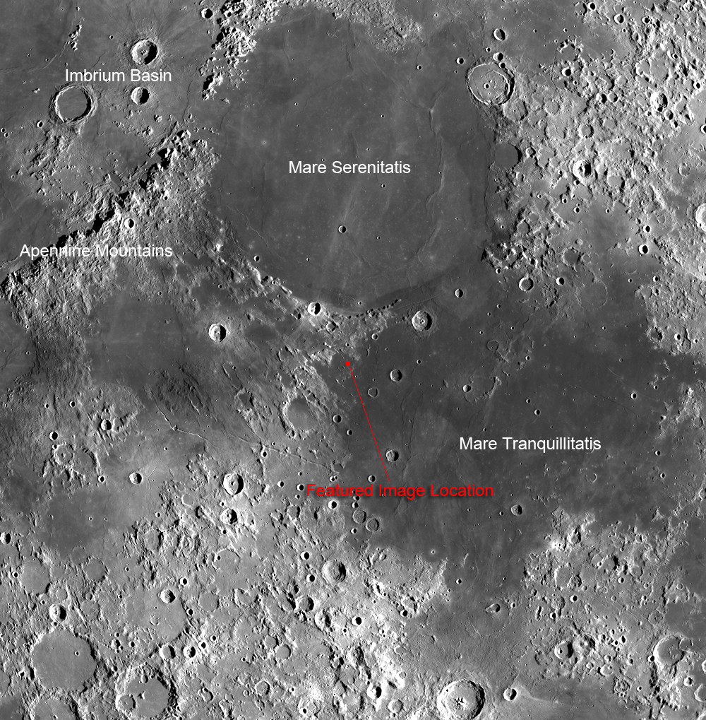These mountains are members of a group of mare-surrounded highland structures nestled between Mare Tranquillitatis and Mare Serenitatis. Examination of the region will quickly reveal a strong northwest to southeast trending orientation to most of the upland features that points directly back to the Apennine Mountains, which form the southeastern rim of the Imbrium basin. Now we can see that this whole region was sculpted by ground-hugging forces unleashed in the terrible cataclysm that formed that basin. Imagine witnessing this awesome event from the Earth over 3 billion years ago; it would have been clearly visible to the unaided eye!