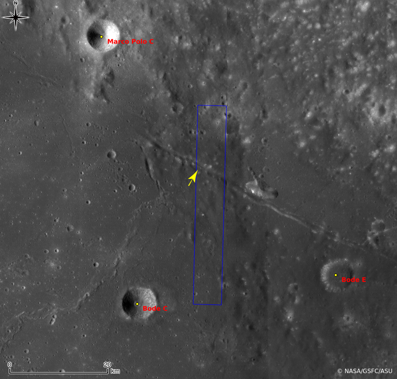Today's Featured Image highlights a portion of an unnamed linear fissure located along the eastern edge of Mare Insularum, near the mare/highland boundary. The width of this fissure varies from about 1.5 to 2 km, its length is about 90 km, and it extends in the northwest-southeast direction. The upper-right portion of the opening image, showing a shallow groove extending from up to middle right of the image, corresponds to the bottom of the fissure. Thus most of the image reveals the southern wall of the fissure.