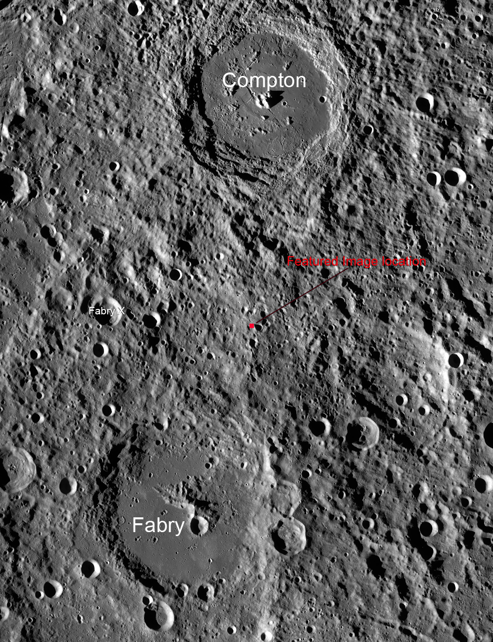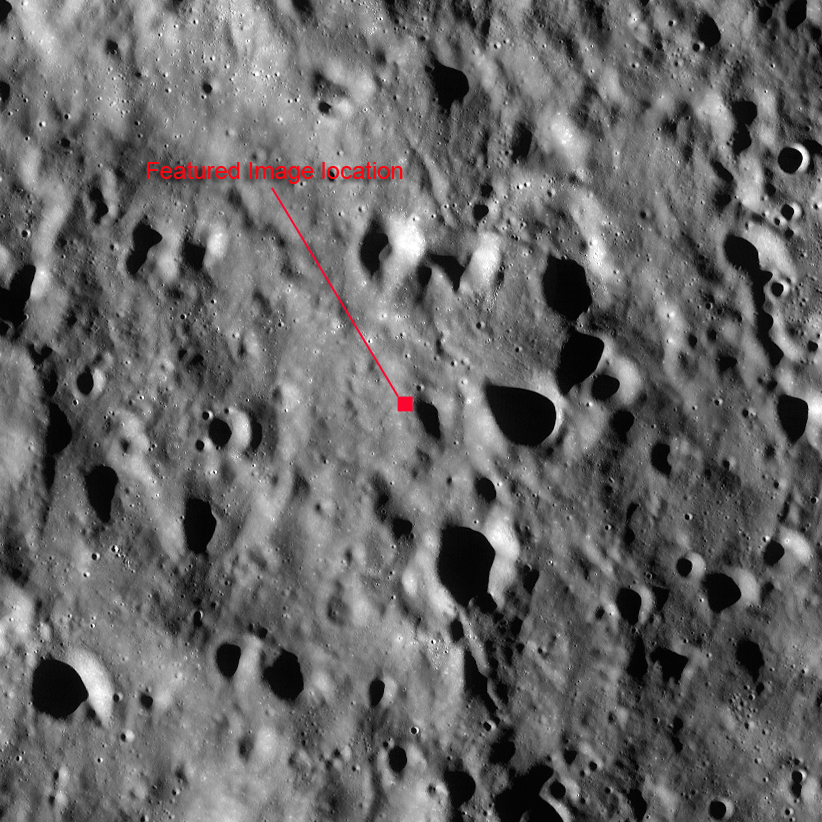 But even here nothing unambiguous catches the eye. The secondary impacts could have resulted from one of any number of craters, or perhaps from an impact located even further away. A detailed surface study would be necessary before a definitive link could be made tying this ejecta with its crater of origin. Explore the full NAC frame below. Other examples of ejecta interactions with the lunar surface can be found in Crater Chain near Rima T Mayer, Four of a Kind in Catena Davy, and Four Leaf Clover.