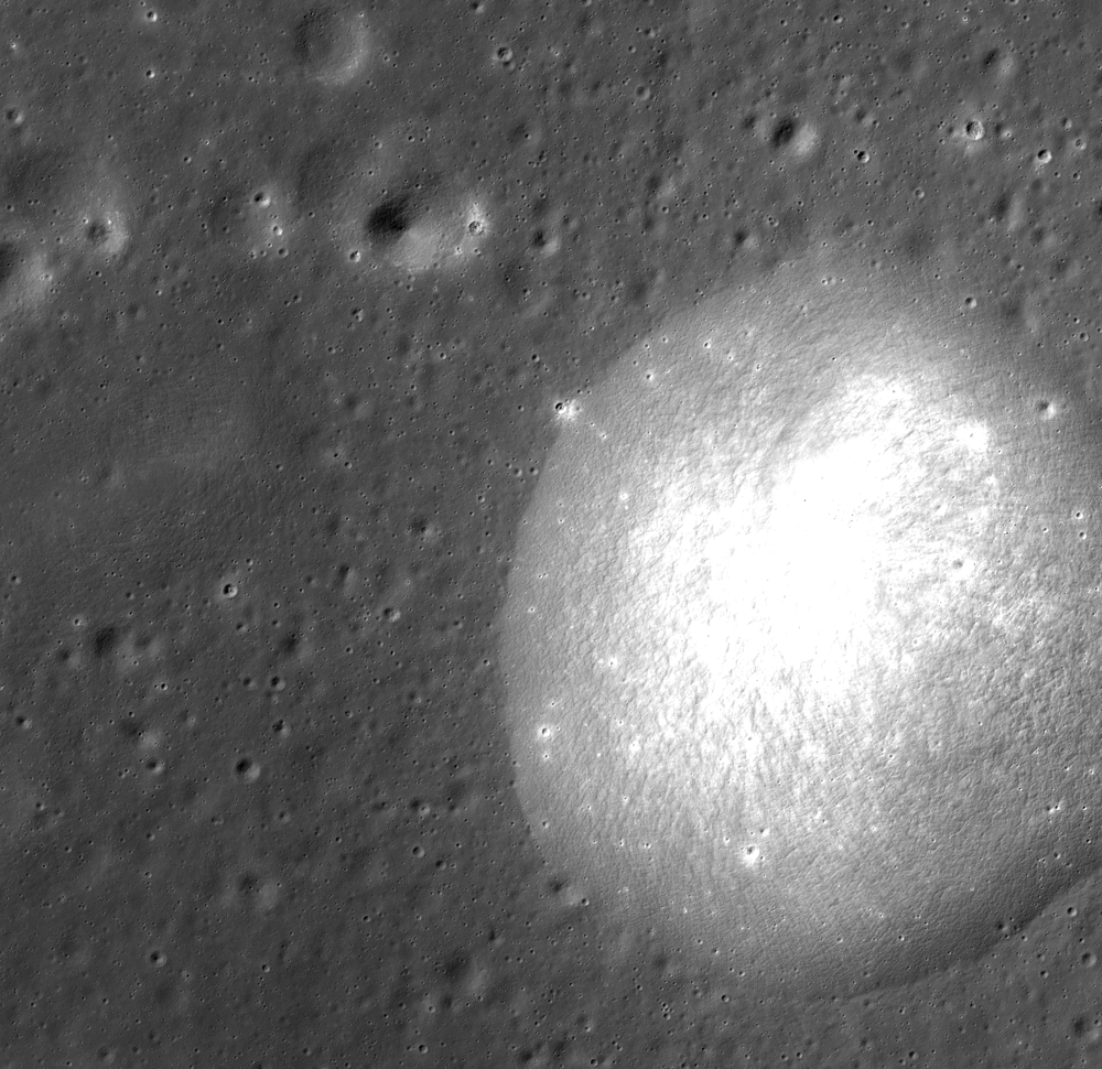 The circular feature is more reflective than the mare that surrounds it. In this case, the Sun is coming from the west, illuminating the western slope, so perhaps the eye is simply seeing the effect of topography facing the Sun? Or could the higher reflectance also be the result of a composition difference? If the mare and the circular feature were of the same composition, we would expect to see a smooth gradient both in the reflectance and the topography as you move from the mare up onto the mountain. In this case, however, the boundary between the mare and the mountain is sharp.