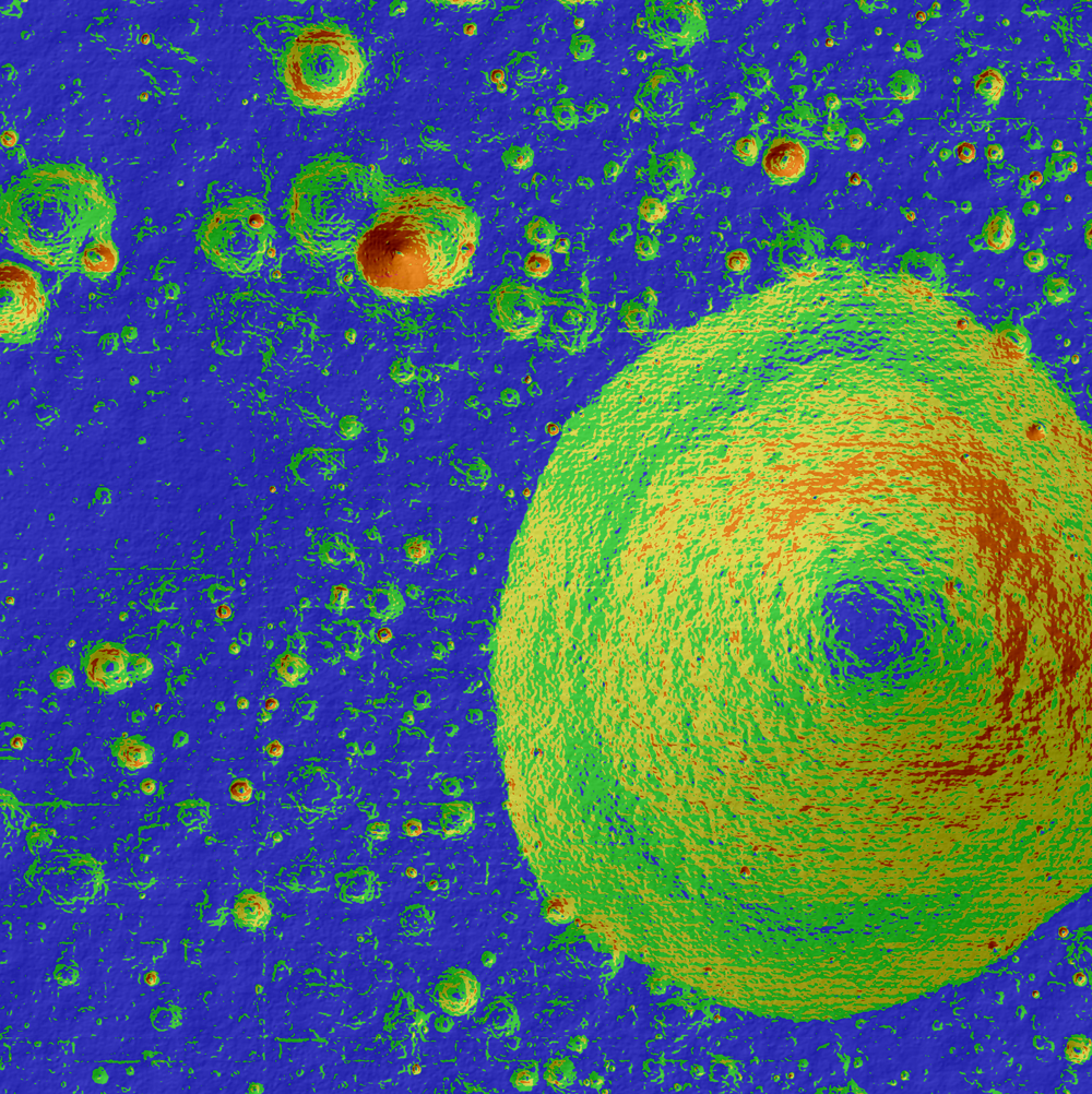 A color coded slope map generated from an LROC NAC DTM and centered at 35.969°S, 164.497°E. The colors represent slope; blues are more flat (1-3°), and orange is steeper (~11°). The mountain is approximately 2.5 km in diameter [NASA/GSFC/Arizona State University].