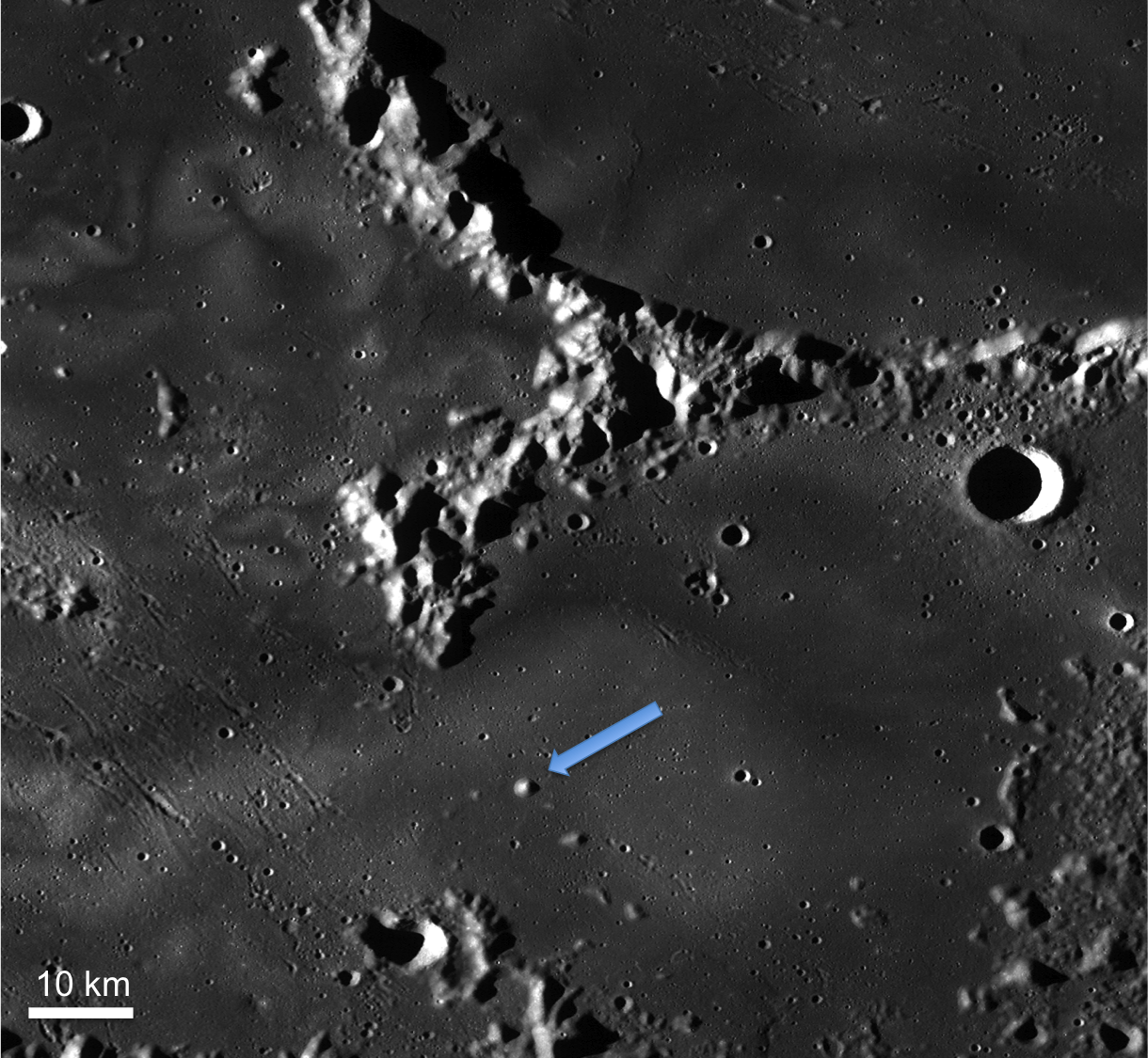 LROC WAC image of Mare Ingenii. The blue arrow indicates the mound of interest. This image is approximately 120 km wide [NASA/GSFC/Arizona State University].
