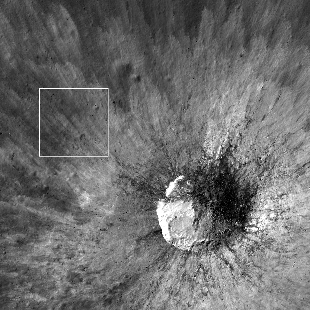 The boulders in the Featured Image all curve to the northeast, carving dark paths across the fresh rays from a small 525-m diameter crater (located on the lunar farside, northeast of Van Gent U, 17.233°N, 157.367°E). The boulders originated from the impact crater itself, being ejected during the impact event with a velocity radial to the crater rim. As the boulders bounced and rolled along the surface they lost speed (kinetic energy) and slowed, creating gently curving paths until they came to a stop. The curved paths are likely caused by the preexisting slope of the topography, which is slightly downward sloping to the northeast (~10°). The linear striations of the fresh ejecta define the radial direction away from the crater and provide a beautiful contrast for the curved boulder paths. Overall, the fresh material was ejected at higher velocities than the boulders so it is not influenced by the topography and remains on a trajectory radial to the crater.