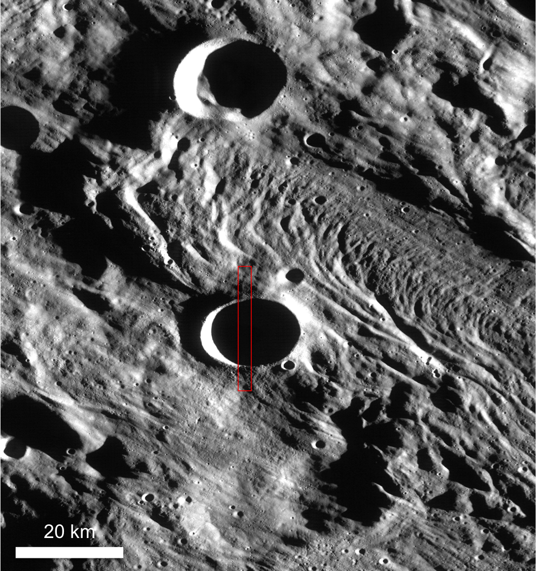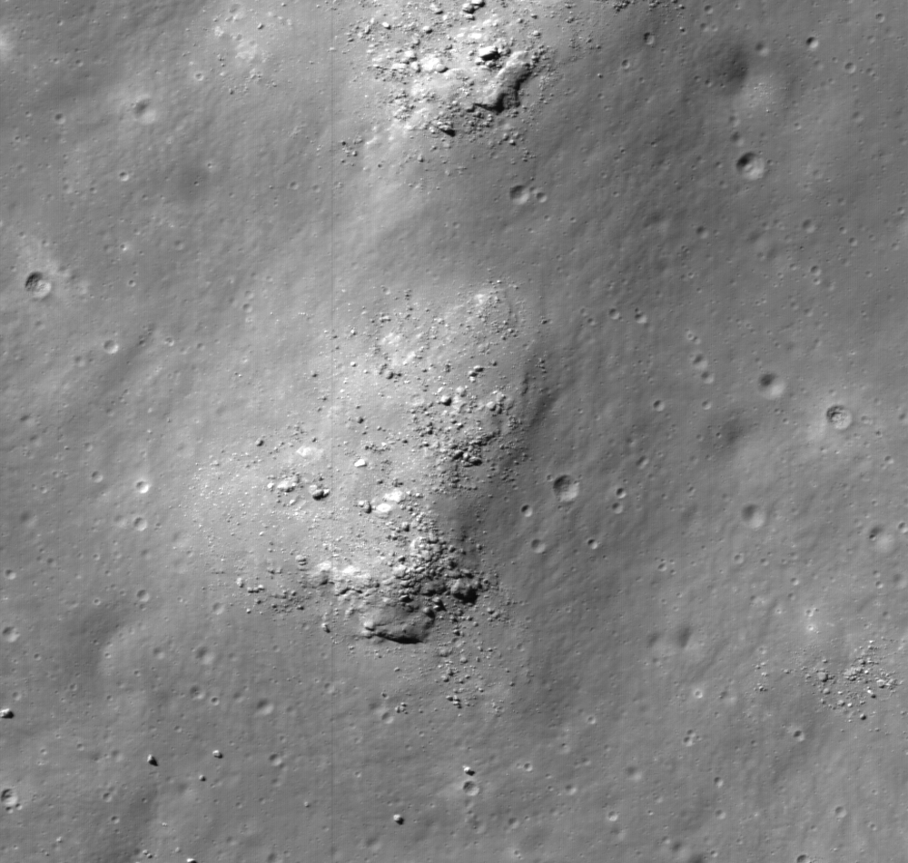 The floor of Inghirami C is littered with boulders that are commonly perched atop closely spaced mounds, some of which are as large as 700 meters by 1000 meters. The presence of these mounds and boulders gives the floor of the crater a lumpy appearance. If simple craters are supposed to be bowl-shaped, where did the material come from to form the mounds? Inghirami C is located southeast of Orientale basin and is adorned with spectacular patterns of ejecta during the basin forming event. Could the lumps and boulders be material from Orientale?