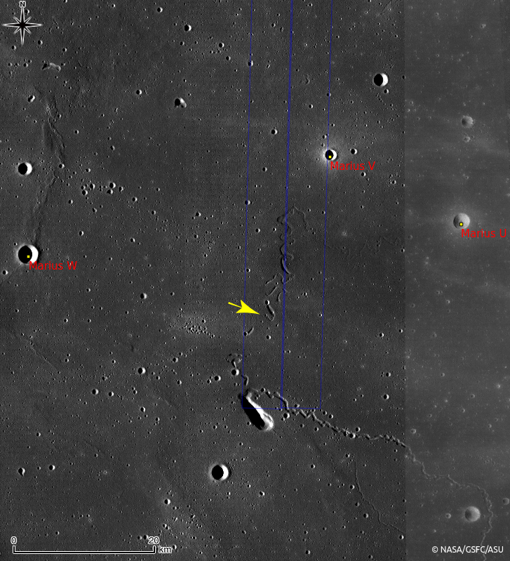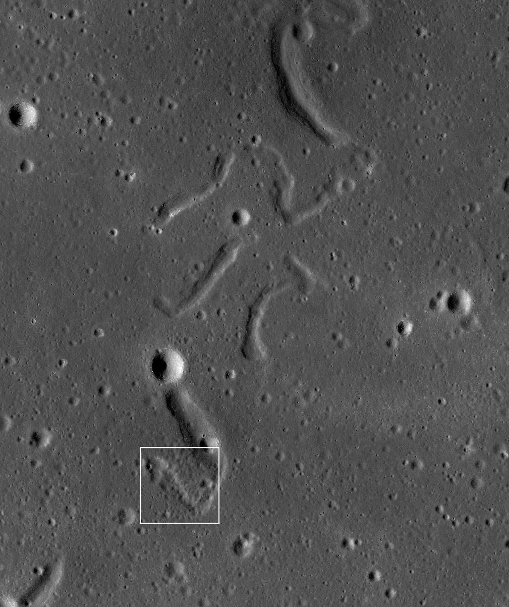 About 1 km north from the northern end of Rima Suess, there are 5-7 enclosed, irregularly aligned sinuous depressions (see next NAC context image). These are likely all related to another Sinuous rille (about 30 km long) at the north of these depressions (see WAC context image). The opening image highlights the southern, less well-developed tail of one of these irregularly-aligned sinuous depressions. The subsidence here seems to have proceeded unevenly and then stopped, although it is possible that the subsidence is still ongoing, albeit very slowly.