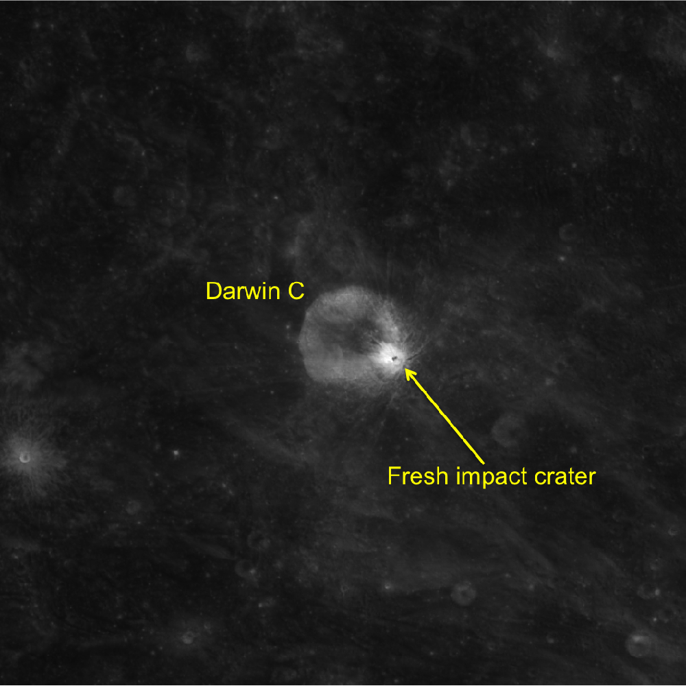 We previously published a portion of the spectacular ejecta pattern of an unnamed fresh impact crater. Today's Featured Image is a broader LROC NAC mosaic of the source where that ejecta originated. This unnamed crater does not have a circular shape, because it formed on the sloped wall of Darwin C crater. Soon after impact, gravity took over, pulling large boulders and fine debris down the crater wall. Zooming in on the ejecta, you can see ~6 m diameter boulders that "etched" their way down the crater wall, leaving trails in the granular ejecta as they tumbled downhill.