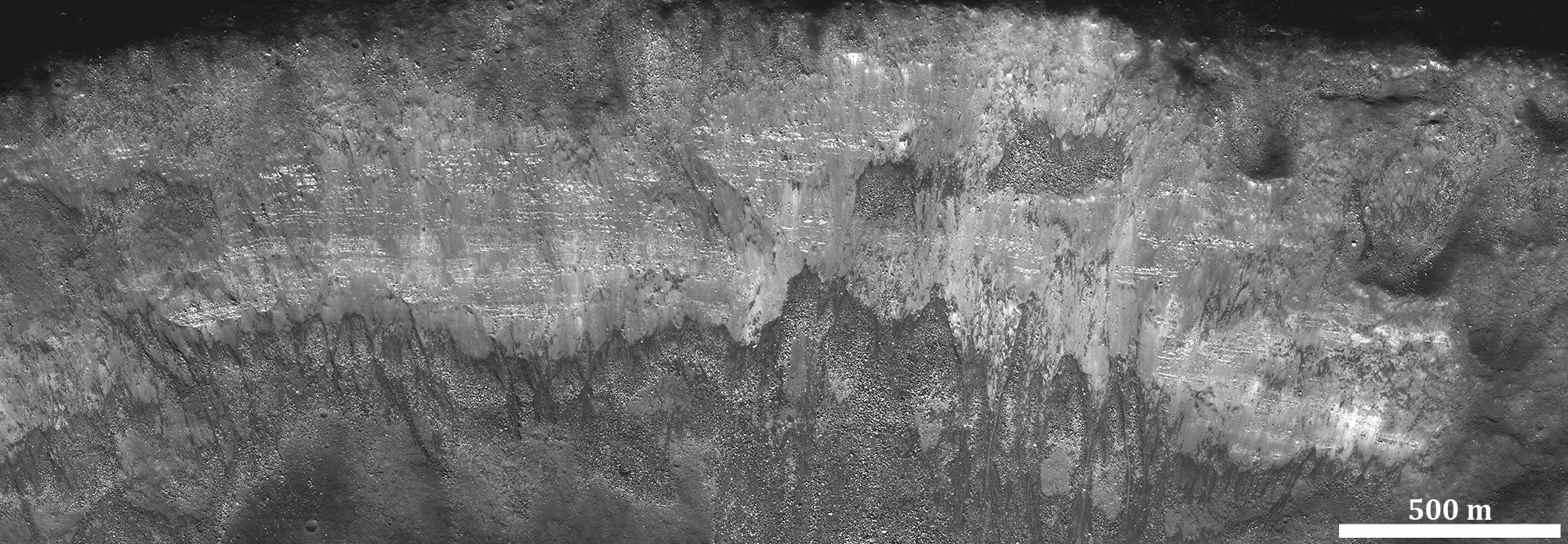 Banded layers of mare basalts revealed in the east wall of Herigonius crater. The crater rim crest is located outside the top of the image (north to the left). Debris and boulders accumulate downslope (bottom) toward the crater floor. LROC NAC M150741485; image width 500 m [NASA/GSFC/Arizona State University].