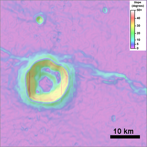 Slope map (overlain on shaded-relief) of Herigonius crater generated from the WAC GLD100 product. Steeper slopes shown in red, lower slopes are purple and blue. Red areas, including the east wall, have slopes around 40° and correspond to outcrops of banded mare layers [NASA/GSFC/Arizona State University].
