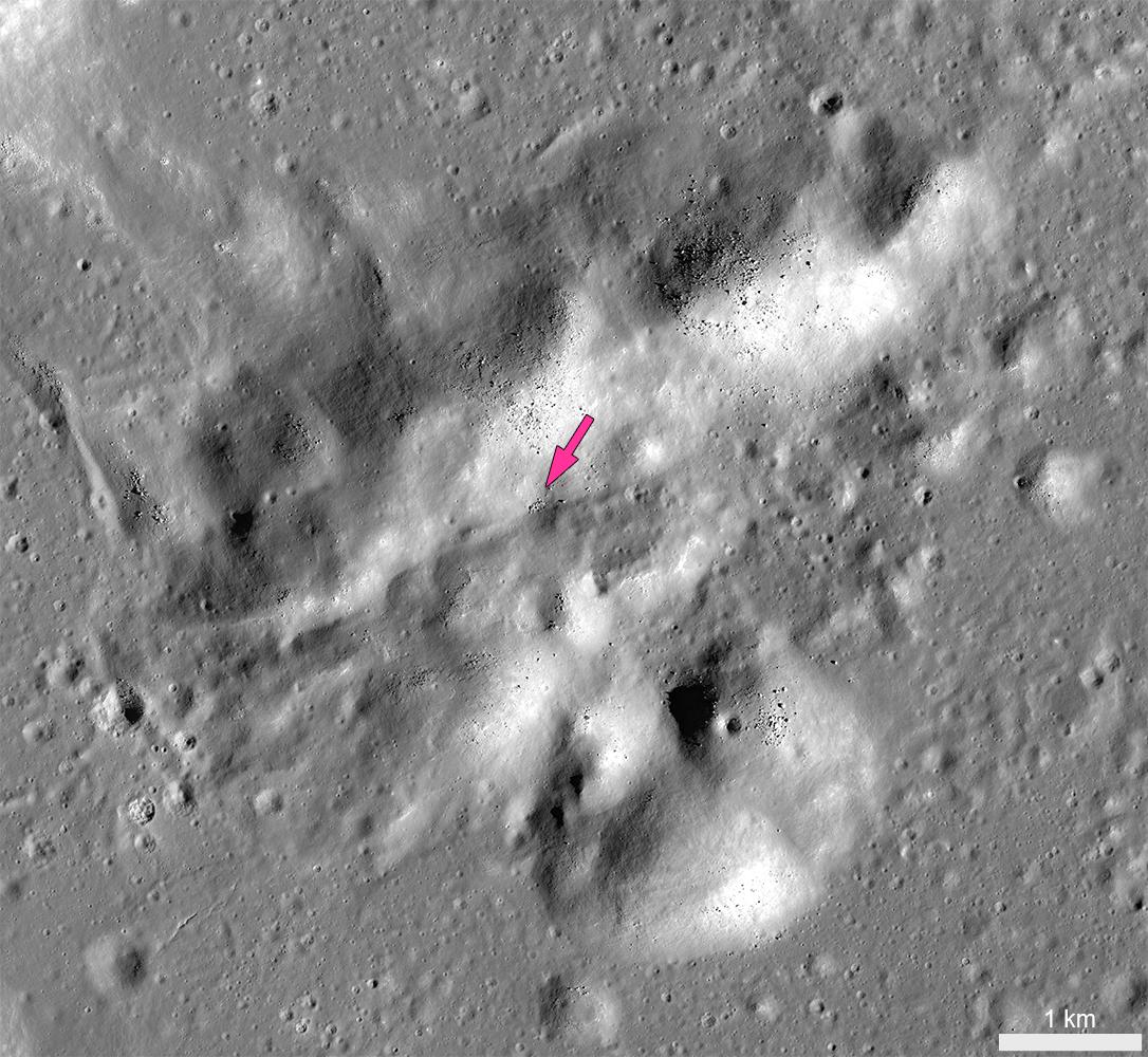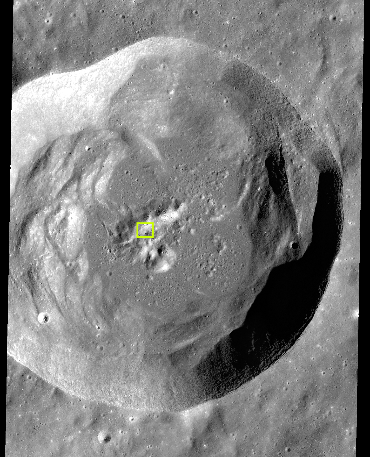 Today's Featured Image closely examines part of the central peak of Steno Q. The central peak is roughly 10 km wide and consists of tall mountains more than 2 km high. The crests of several of these mountains are blocky and composed of highly stressed and fractured materials from the deepest part of the crater. Over time, boulders perched on these steep slopes can roll downhill as a result of seismic tremors and the shaking caused by nearby impacts. A small depression near the middle of the central peak preserves a collection of boulders accumulated from upslope. Some of these boulders are more than 20m wide -- as big as a house! To get an idea of just how big that is, watch this video of Apollo 16 astronauts Duke and Young approach a similarly sized rock. The Apollo 16 "House Rock" is located on the rim of a small, roughly 1-km diameter crater, North Ray crater. In Steno Q, boulder trails of the most recent boulder falls indicate the source of the material upslope. Boulder accumulations like this provide a unique opportunity for future explorers to collect a variety of materials derived from potentially inaccessible areas (such as steep mountain peaks).