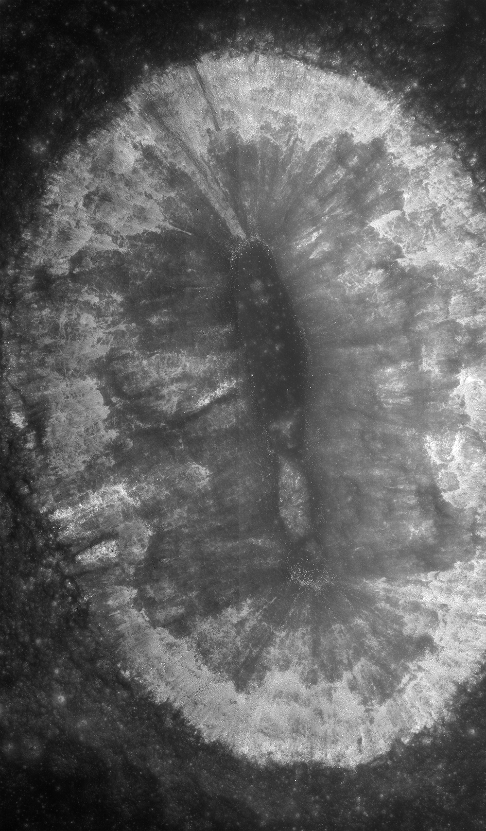 This crater's elongated shape is perhaps due to an oblique impact, which impart excess horizontal momentum into the surface leaving an elongated shape. However, for this to happen it is thought that a projectile had to be coming in less than just 30° above the horizon. Volcanic vents can also display elongated shapes, but they don't exhibit raised rims and usually lack a flat floor, both features are seen in this crater.