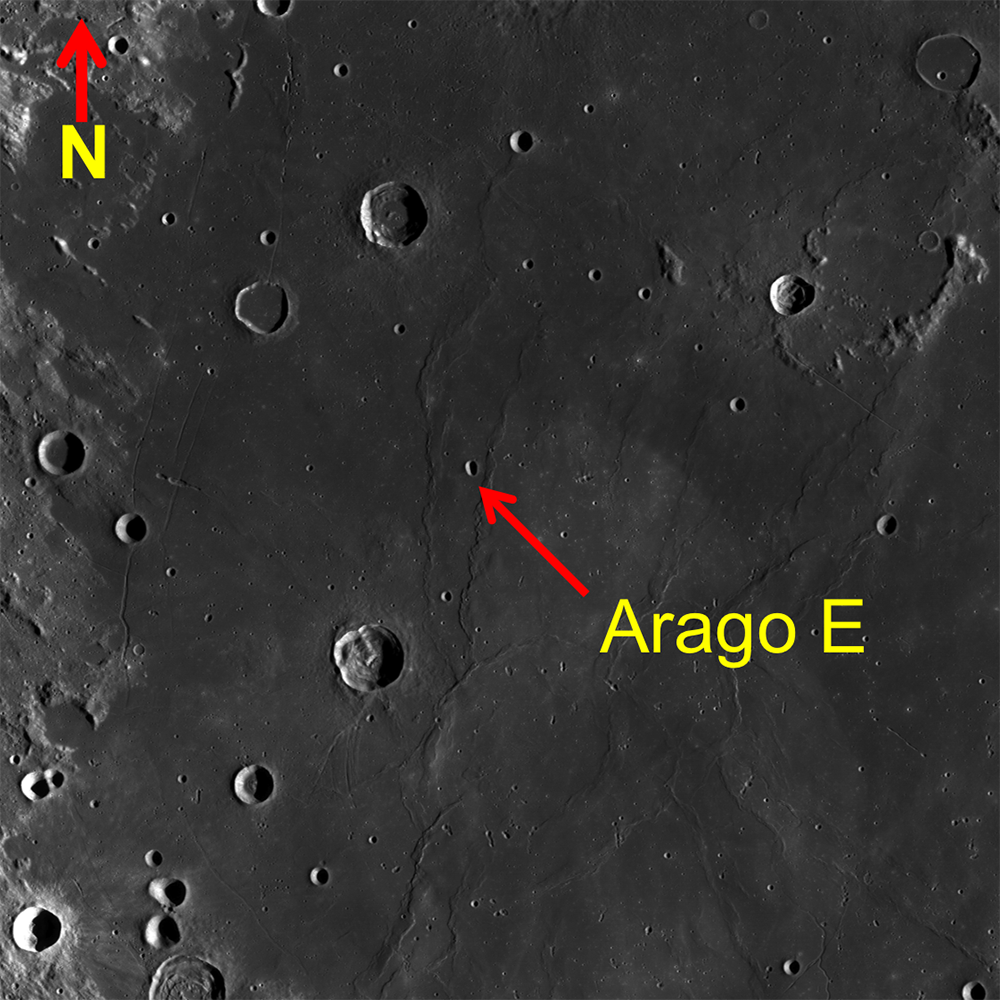 Arago E (8.5°,22.71°) is an elongated crater located in Mare Tranquillitatis, site of the first Apollo landing, Apollo 11! Arago E is nestled between two wrinkle ridges (see WAC context image below), which are tectonic features formed by deformation of the basaltic rocks that make up the lunar maria. Massive maria lavas placed an extra load on the surface, these deformations are adjustments of the surface due to the unrelenting force of gravity buckling the rock.