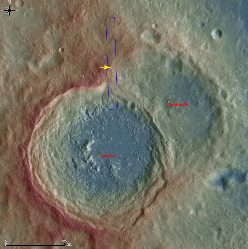 Vavilov D is an heavily degraded crater (~96 km in diameter) located between the Orientale basin and Jackson crater. The later formation of Vavilov crater (~99 km in diameter) destroyed the southwestern half of the Vavilov D. Today's opening image highlights the northwestern portion of the Vavilov D wall (see next context image). The relatively smooth textured area in the upper left corresponds to the outside of Vavilov D, and the rest of rough/craggy surface is the interior crater wall slope.