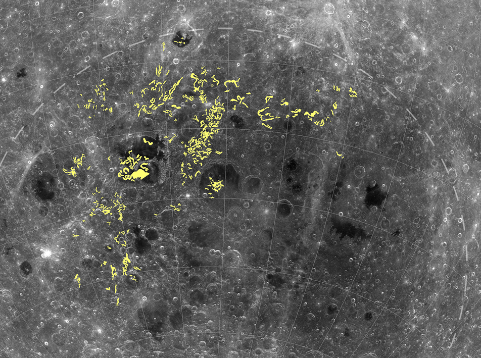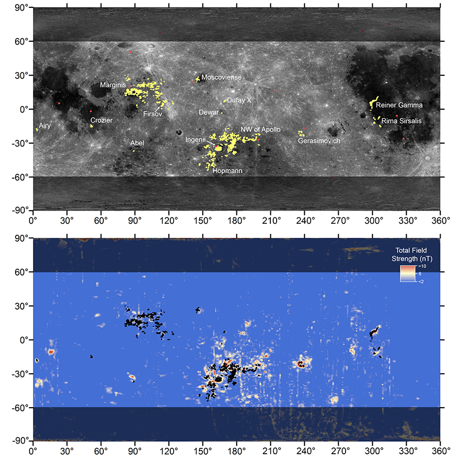 The resulting map, shown above, confirmed that swirls are all associated with crustal magnetic anomalies (though not all magnetic anomalies have swirls). It also revealed previously unmapped swirls in several areas, including some swirls within the South Pole–Aitken basin. Rather than existing as several discrete geographic groupings, swirls stretch nearly continuously across the northwest portion of the Moon's largest impact basin, and include the famous swirls of Mare Ingenii.