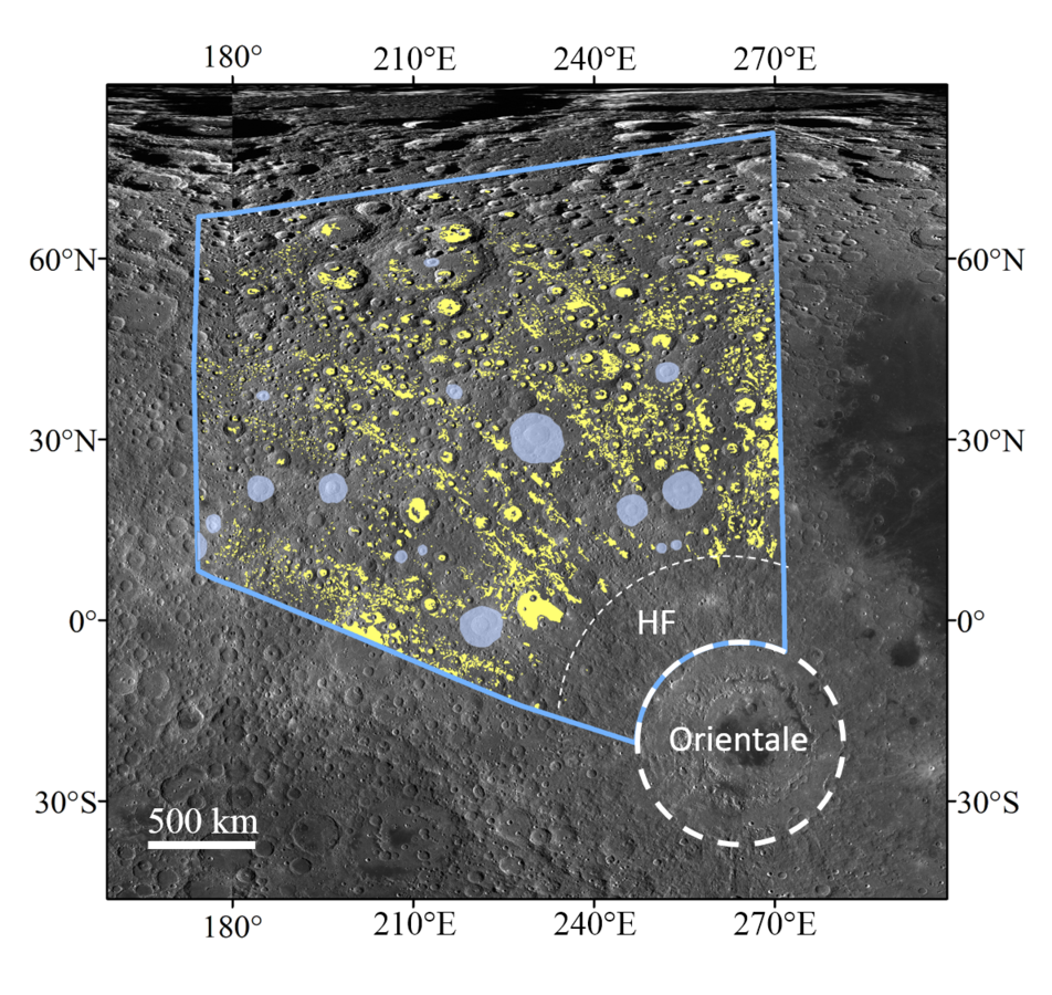 This new map shows that the areal abundance of light plains increases dramatically just outside the continuous ejecta of Orientale, peaks at around 1,400 km from the rim, and then decreases rapidly with distance. This distribution is consistent with the expected distribution of ejecta, suggesting that the light plains within the study area formed as ejecta from Orientale.