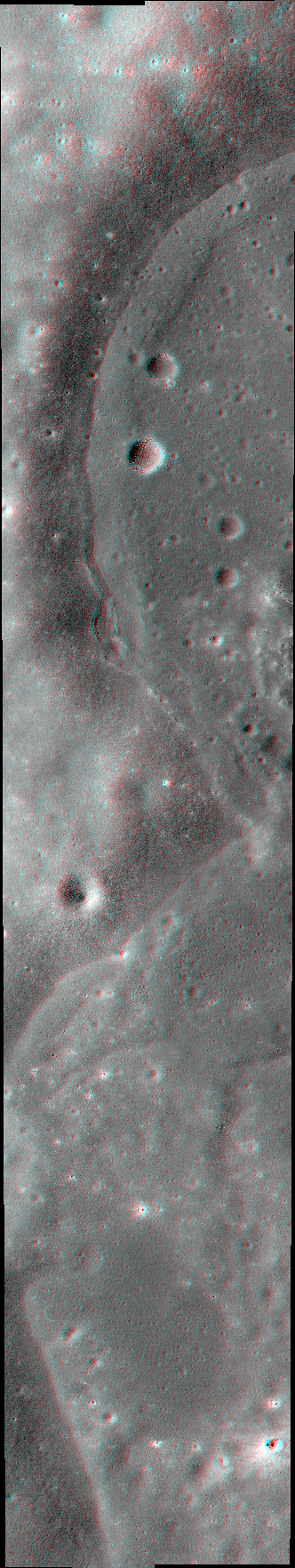 Anaglyph of the western edge of Lacus Solitudinus, a lava-flooded region that includes Bawa and Bowditch craters. The anaglyph is located at 25.42°S, 102.60°E. NAC images M1113495395L/R, M1113488291L/R [NASA/GSFC/Arizona State University].