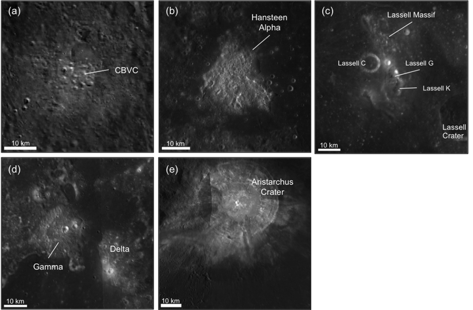 Several of the silicic sites identified on the Moon. a) Compton–Belkovich Volcanic Complex (61.1°N, 99.5°E), b) Hansteen Alpha (12.3°S, 50.2°W), c) Lassell Massif (14.7°S, 9.0°W). d) Gruithuisen Domes (36.6°N, 40.1°W), e) Aristarchus ejecta (23.2°N, 48.2°W). All images were created by overlaying a WAC normalized reflectance mosaic on the WAC global 100 m/pixel mosaic [NASA/GSFC/Arizona State University].