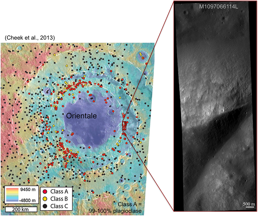 The reflectance values measured at lunar silicic sites are similar to reflectance values of exposures of nearly pure anorthosite (PAN) in the Inner Rook Ring of Orientale. PAN exposures have little to no mafic minerals and are some of the most highly reflective materials on the Moon. The LROC team is currently targeting identified exposures of PAN in order to gather more data on their composition. The known composition and measured reflectance of PAN materials will be useful for comparing with the reflectance of silicic/rhyolitic areas, which also have low mafic contents but unknown compositions.