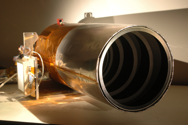 One of the LROC Narrow Angle Cameras (NAC), photographed in a cleanroom at Malin Space Science Systems in San Diego last year. The long silver tube is the baffle for straylight rejection. It is made of carbon fiber. The golden part of the NAC is the optics, a Ritchey-Chretien telescope with an aperture of about 7.7 inches (19.5 cm), which focuses the light onto a CCD line-scanner in the back (not visible). For scale, the NAC has a diameter of about 10 inches (26 cm) and a length of 27.5 inches (70 cm).