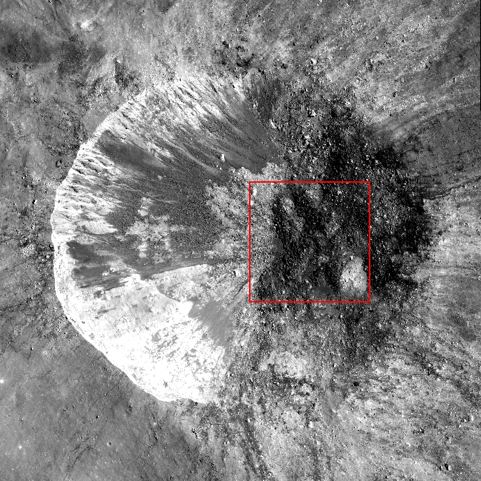Context image from NAC frame showing full crater morphology; image is approximately 1.9 km across. Red square shows Featured Image location [NASA/GSFC/Arizona State University].