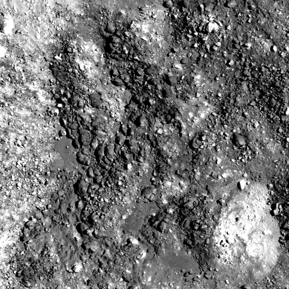 Appearing highly textured, a mixture of boulders, cobbles, and fine material partly fills a relatively fresh impact crater (12.7°S, 291.2°E). NAC image number M112047758R; incidence angle 35°; sun is from the east; north is up; image is ~480 meters across [NASA/GSFC/Arizona State University].