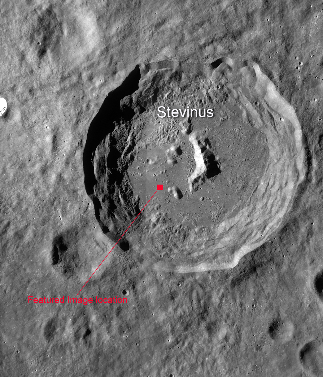 Today's image explores a portion of the Stevinus crater floor (southern hemisphere, nearside highlands). Here we see a topographic feature that can be found by the dozens throughout the area in many shapes and sizes. These mounded forms show positive relief upon a flat surface of ponded impact melt deposits (now solid). Some are circular, while others show more irregular outlines. Some occur in clusters that appear to have coalesced, and others superpose one another. Some have smooth upper surfaces and others appear deflated with depressed central portions. The featured dome likely superposes an extension crack, indicating that it occurred after the crack formed.