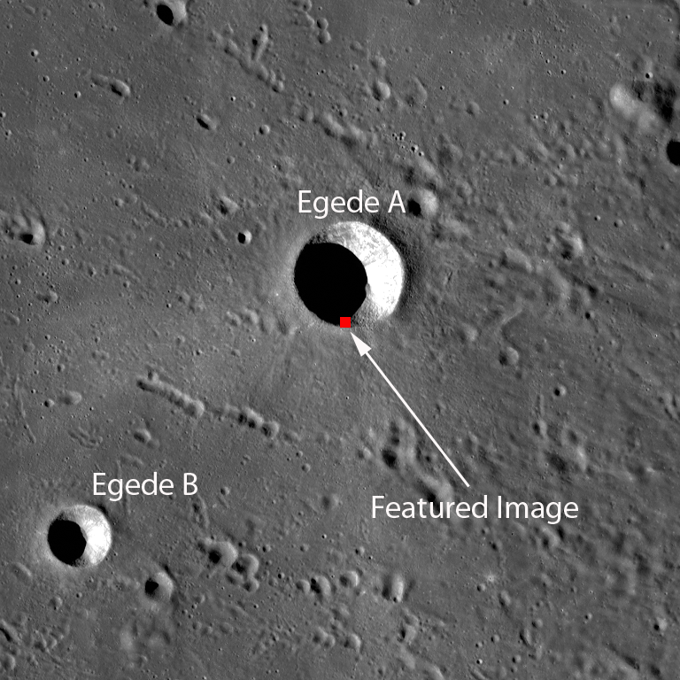Note the faintly visible, light-colored ejecta pattern surrounding Egede A in the image below. This shows it to be a relatively young impact feature. The WNW-ESE trending crater chains to the north and south of Egede A are secondary impacts produced by ejecta from a much larger impact beyond the frame.