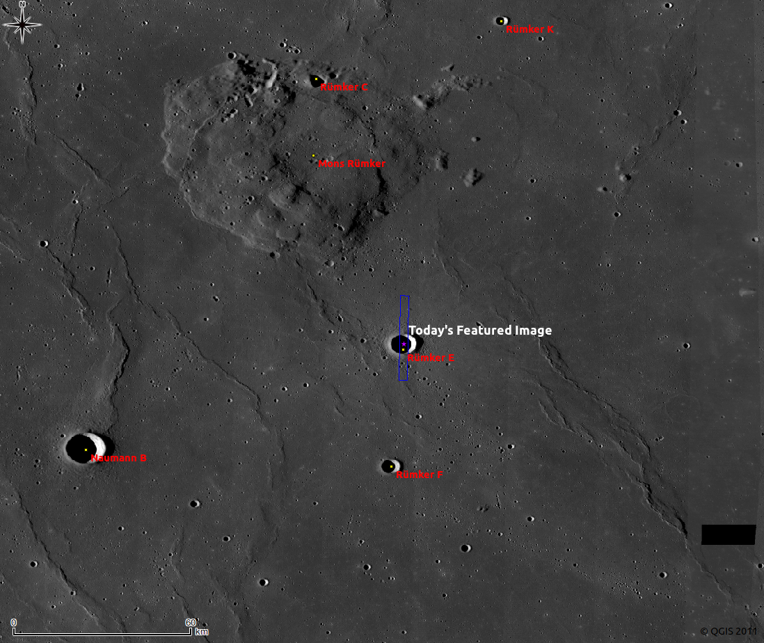 The floor of Rümker E crater is exhibits a variety of beautifully preserved impact melt features. The platy surface, partially submerged boulders, and flows form an invitation to explorers! The edges of the floor are sharply overlayed by debris avalanches from the cavity slopes. How did the flows seen on the left form? Are they impact melt or later debris flows?