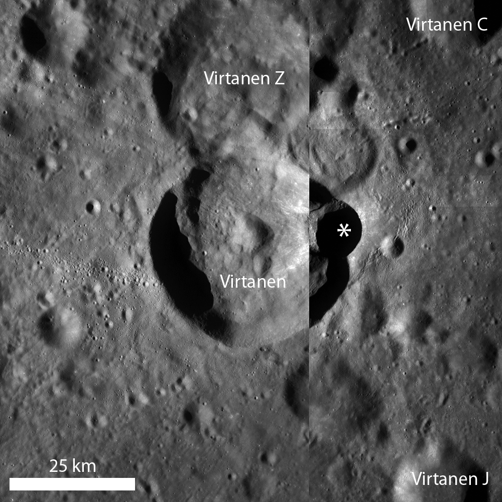 LROC WAC monochrome mosaic of the unnamed crater that impacted into the wall of Virtanen crater on the farside. The location of today's Featured Image is noted with an asterisk. Also note that the context image is composed of two separate WAC images that had different illuminations, which causes the "seam" you see running through Virtanen crater [NASA/GSFC/Arizona State University].