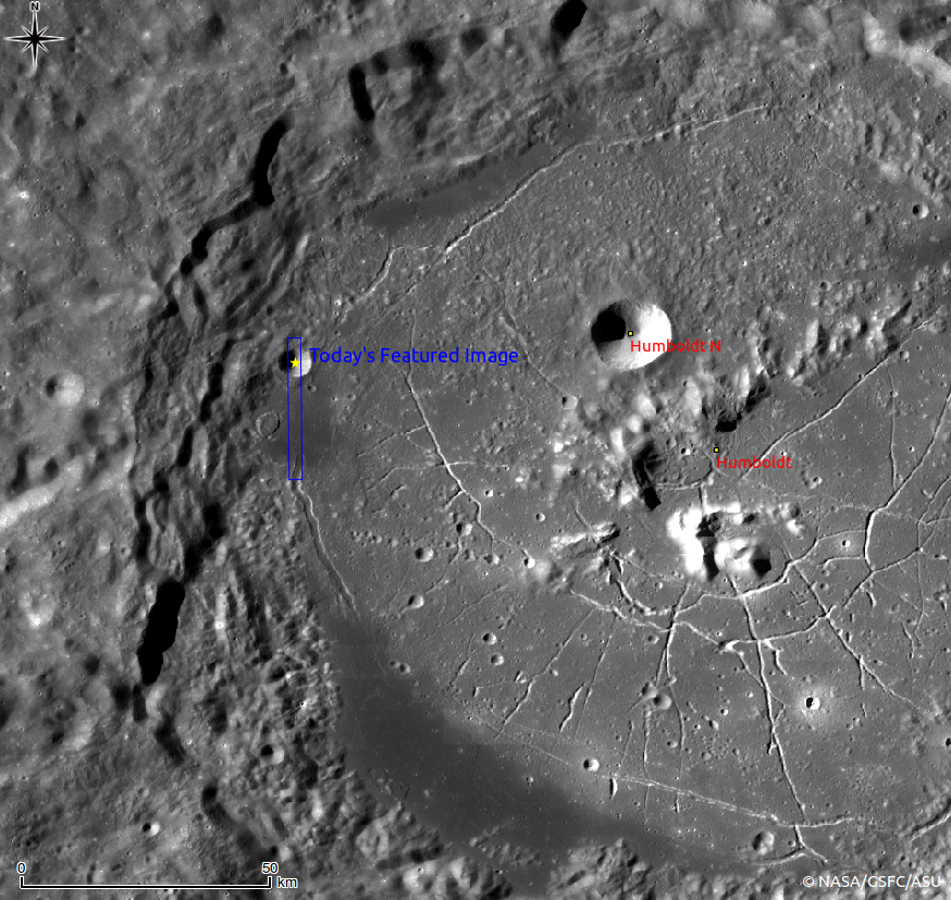 Humboldt crater is a large (207 km diameter) floor-fractured crater, located on the eastern limb as seen from the Earth, about 760 km south of Mare Smythii. The edges of its fractured-floor are partially covered by dark mantle deposits, which are suspected to be pyroclastic in origin.
