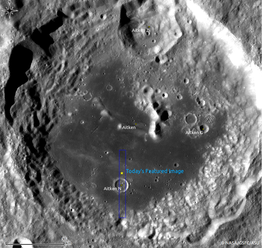 This extremely boulder-rich, unnamed crater is located on the floor of Aitken crater (at the north rim of South Pole Aitken Basin); the diameter is about 480 meters. The floor of Aitken crater is thought to be resurfaced by post-impact lava flows, which corresponds to the low-reflectance smooth surface. The unnamed crater impacted with and excavated these putative lava flows long after the lava solidified.