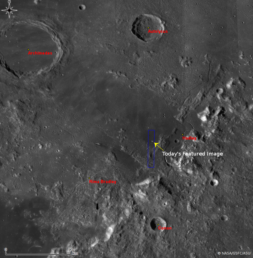 LROC WAC 100 m/pixel monochrome mosaic at south-eastern portion of Mare Imbrium. Yellow arrow and blue square indicate today's Featured Image and NAC footprint [NASA/GSFC/Arizona State University].