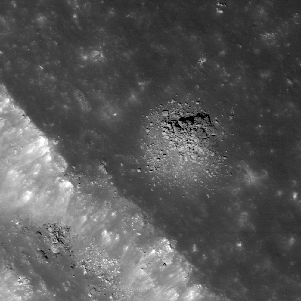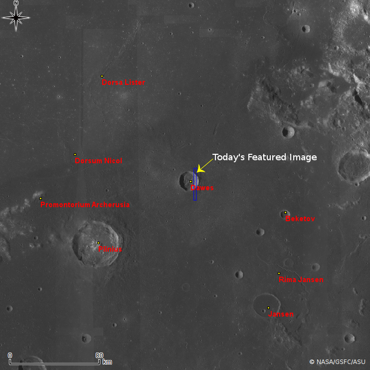 Today's Featured image focuses on an extremely boulder rich mound, located about 100 m east of the rim of Dawes crater. Dawes crater is 18 km in diameter and located at the boundary between Mare Serenitatis and Mare Tranquillitatis.