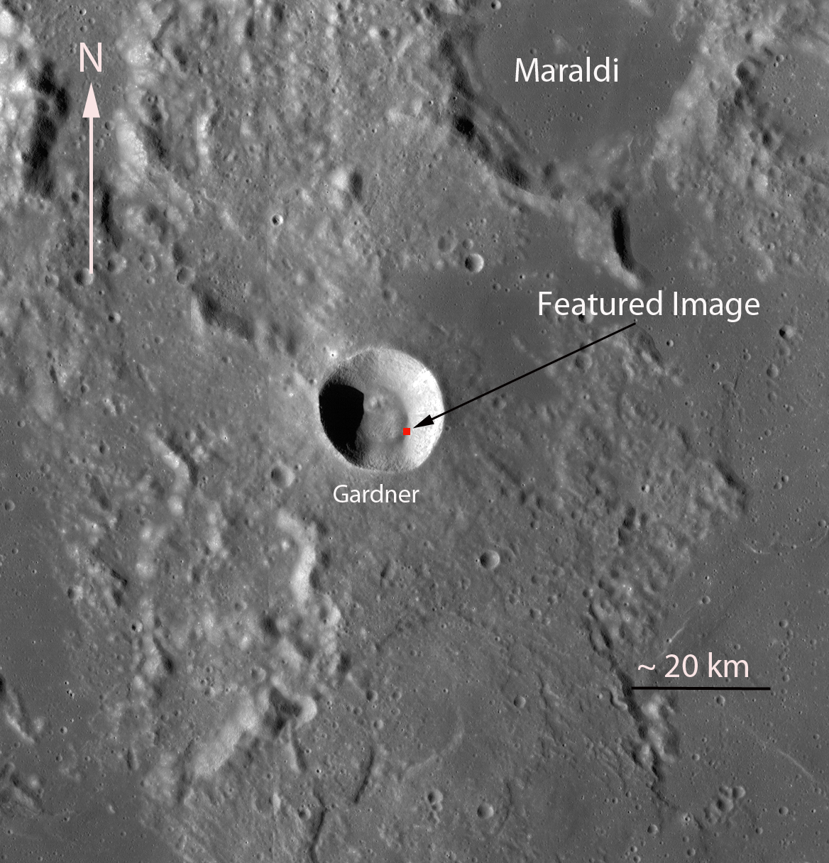 The context image below shows Mare Tranquillitatis basalt deposits visible in the margins surrounding the narrow region of higher terrain where Gardner crater is located. Nearby Maraldi crater (northeast of Gardner) has been filled with similar deposits.
