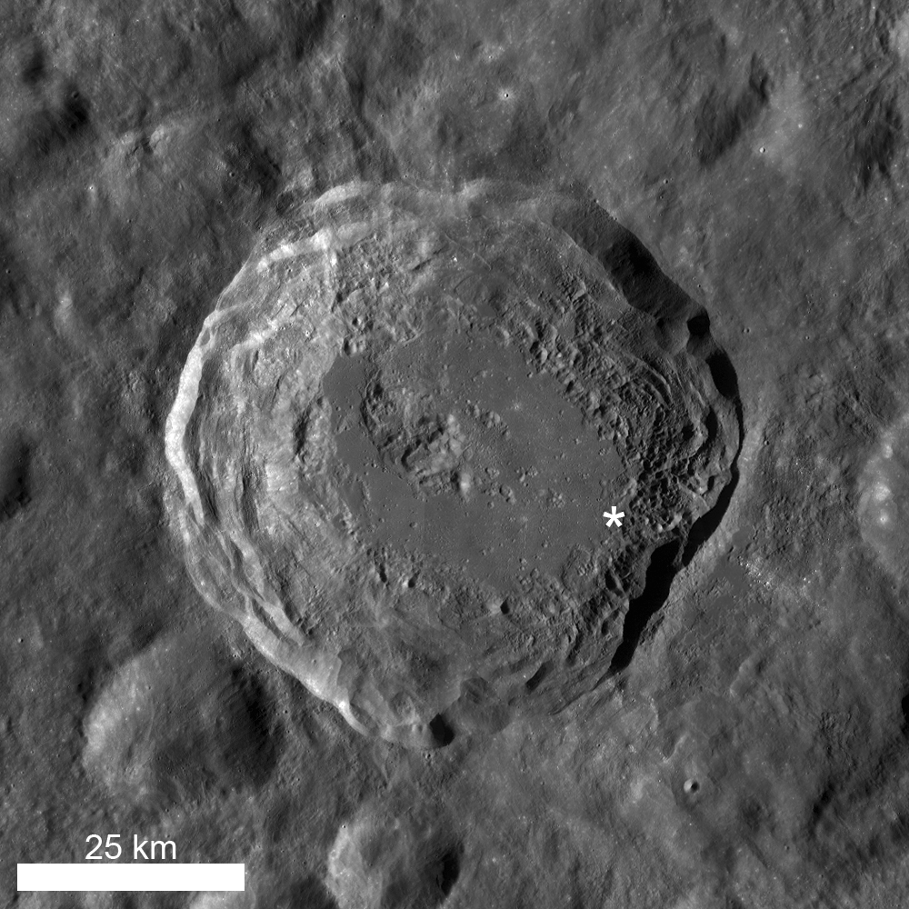 Although difficult to discern in the LROC NAC opening image (but observed in the full frame), there is a topographic bulge in the lower-left, flattening out toward the upper right. This slight difference in topography, probably caused by the proximity to the crater wall, was responsible for the different fracture patterns. As the melt cooled, it experienced stress that promoted crack formation. Cracks, and other types of structural failure, follow the local stress fields and the path of least resistance, which explains why there are at least two different orientations of cracks visible in the opening image. The melt on top of the bulge cracked to relieve the stress of the cooling melt as it stretched over the mound to form in a southeast-northwest direction. The second set of cracks formed in a northeast-southwest direction perpendicular to the first set and most likely result from the stress of cooling so near to the crater wall. However, additional observations and mapping may help better determine the stress fields interacting to create the complicated sets of fractures within this melt pond.