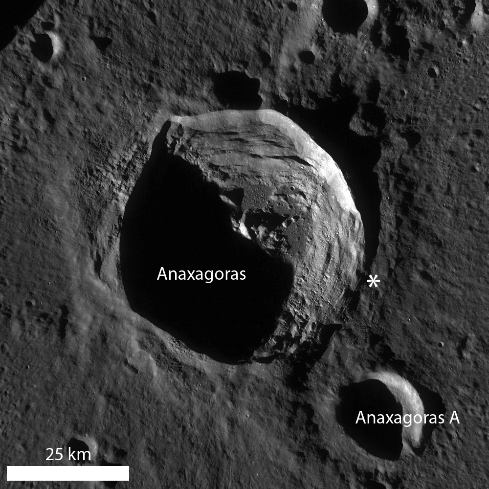 LROC WAC monochrome mosaic of Anaxagoras crater. Location of the exterior impact melt pond noted with asterisk [NASA/GSFC/Arizona State University].