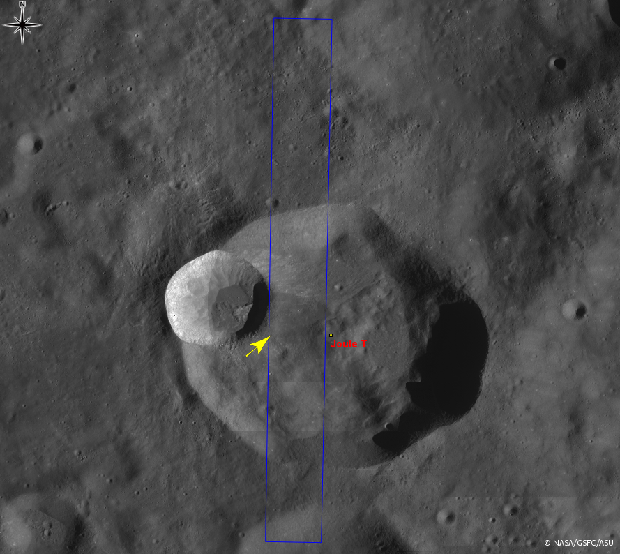 Today's Featured Image highlights a portion of an impact melt sheet that splashed from an unnamed crater about 13.5 km in diameter. This unnamed crater formed on the western rim of a crater nearly three times its size, Joule T (38 km in diameter). In context mosaic below, a yellow arrow indicates a slightly darker region within the blue box, which corresponds to this impact melt sheet. The extent of this melt is about 48 km2.