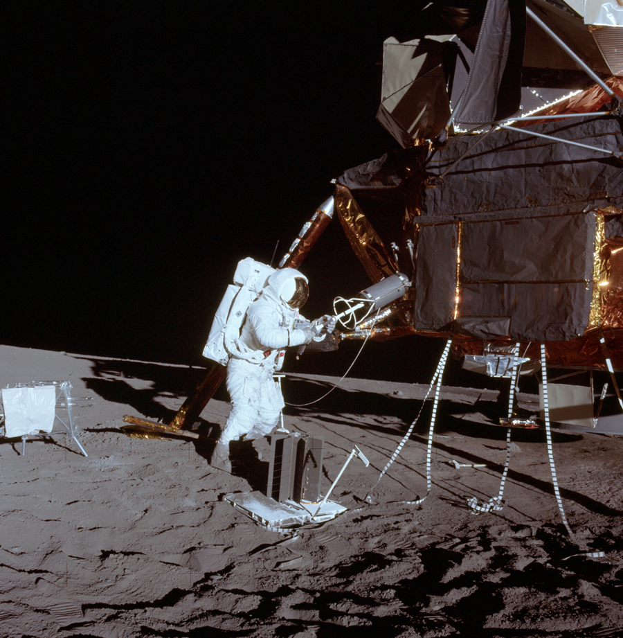 Astronaut Al Bean unloading the plutonium core that powered the ALSEP [NASA Photo AS12-46-6943].